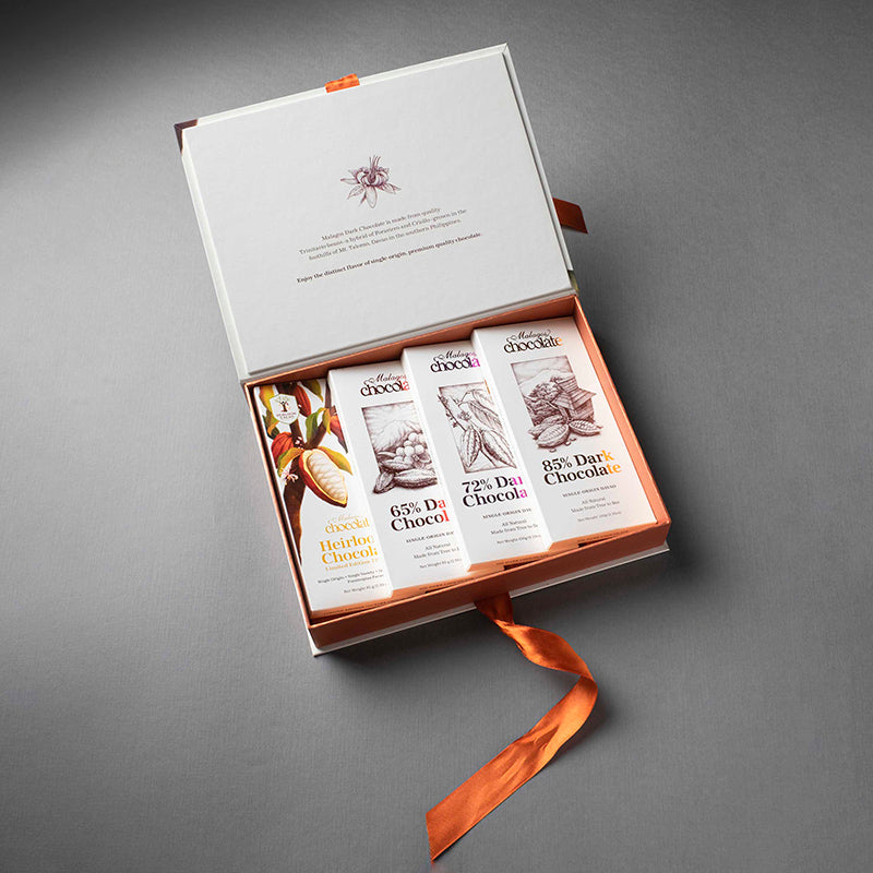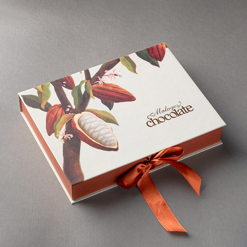 A full stack of our award-winning chocolate bars are now available in the beautifully designed reissued Classic Gift Box in full color featuring original custom artwork adorned with cacao motifs.